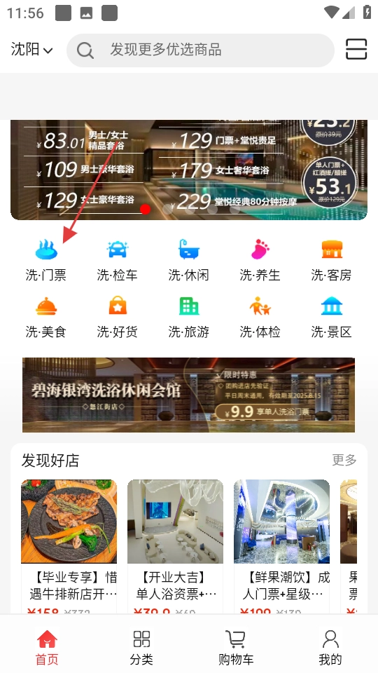 进入软件首页,点击洗门票分类图标。