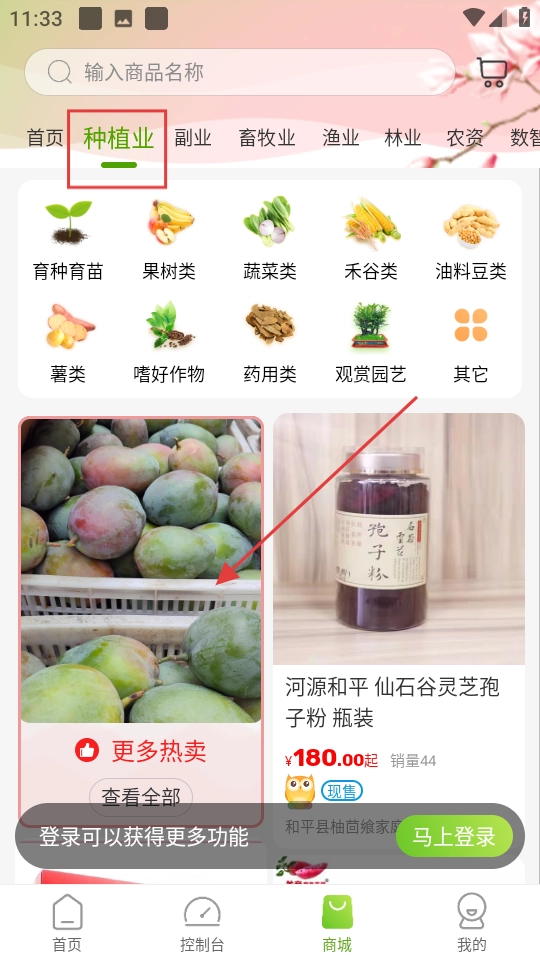 进入商城界面后,找到农业种植相关的类目,点击热门商品板块就能浏览更多商品。