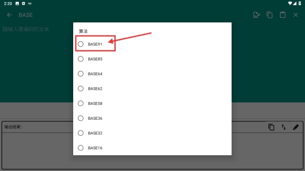 点击算法按钮后,在弹出的算法选择列表中,选择BASE91选项,以此确定编码算法。