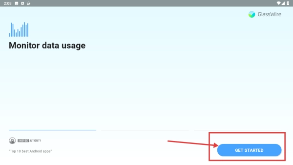 启动GlassWire应用程序,点击GET-STARTED按钮,进入权限配置引导界面。