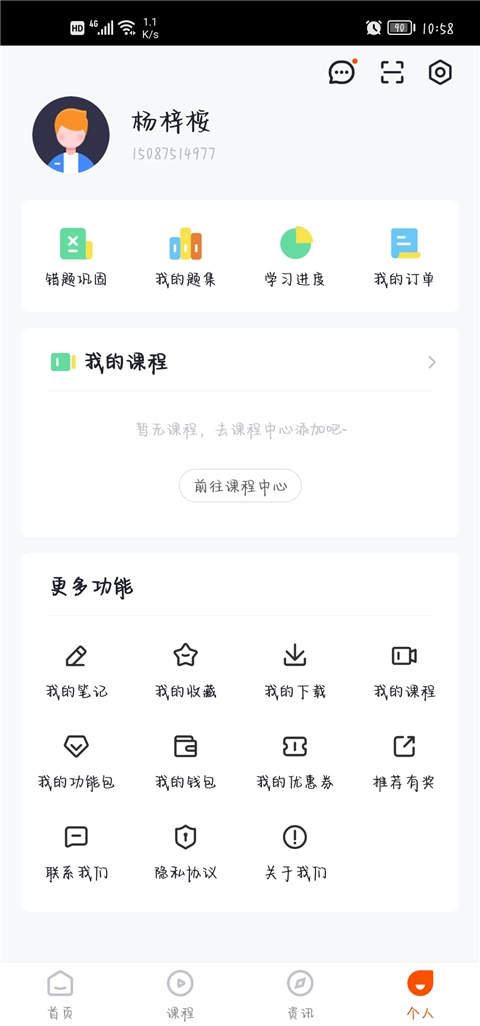 点击进入“我的”页面,这里为用户设置了错题本、学习进度、我的订单等多个功能板块。