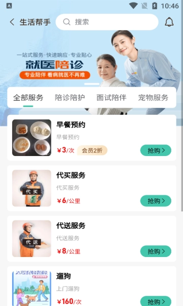 日常服务项目涵盖:就医时的陪诊协助、面试场合的陪伴支持;宠物相关服务,比如遛宠、喂食;代送类服务,像代送干洗物品、代发快递等;还有代买与代取服务。