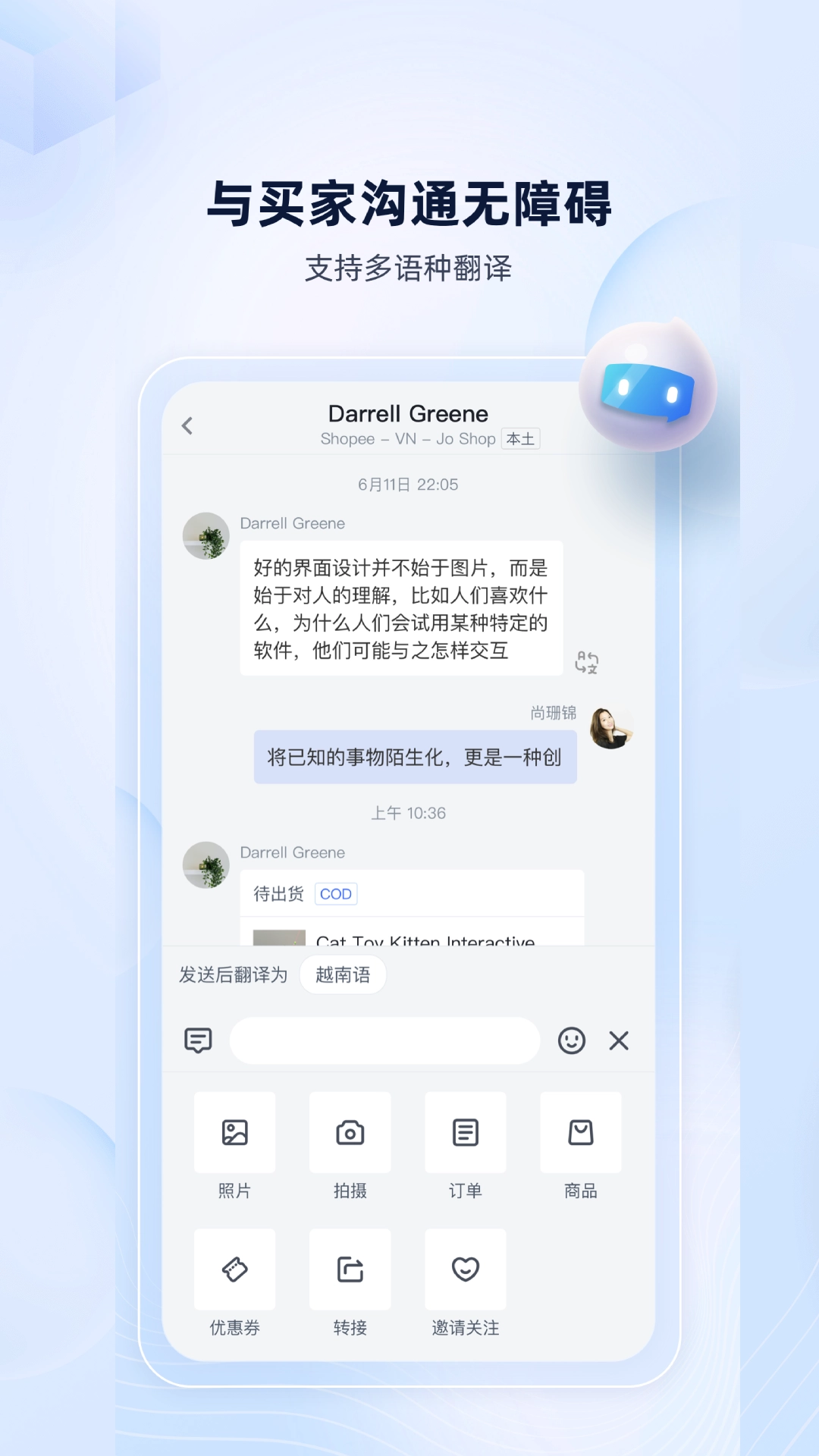 聊天窗口多语种翻译功能,还能发送订单、商品、优惠券等相关信息,让沟通顺畅无阻。