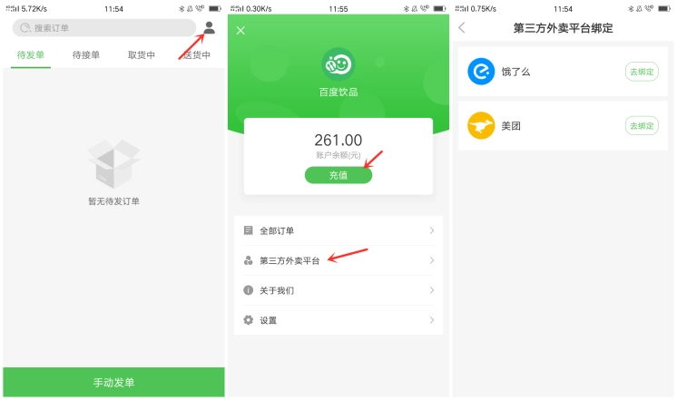 完成上述准备工作后,商家需登录乐外卖快送版,点击“我的”,在第三方外卖平台绑定美团和饿了么店铺。此外,商家在发单前要为账户充值发单余额,充值方式包括总部后台手动充值或商户自行在端内充值。