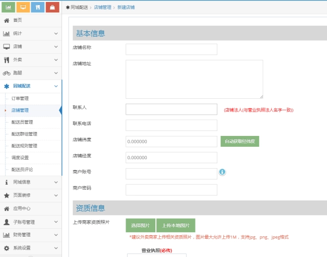 购买同城配送功能,总账号后台新建同城店铺。