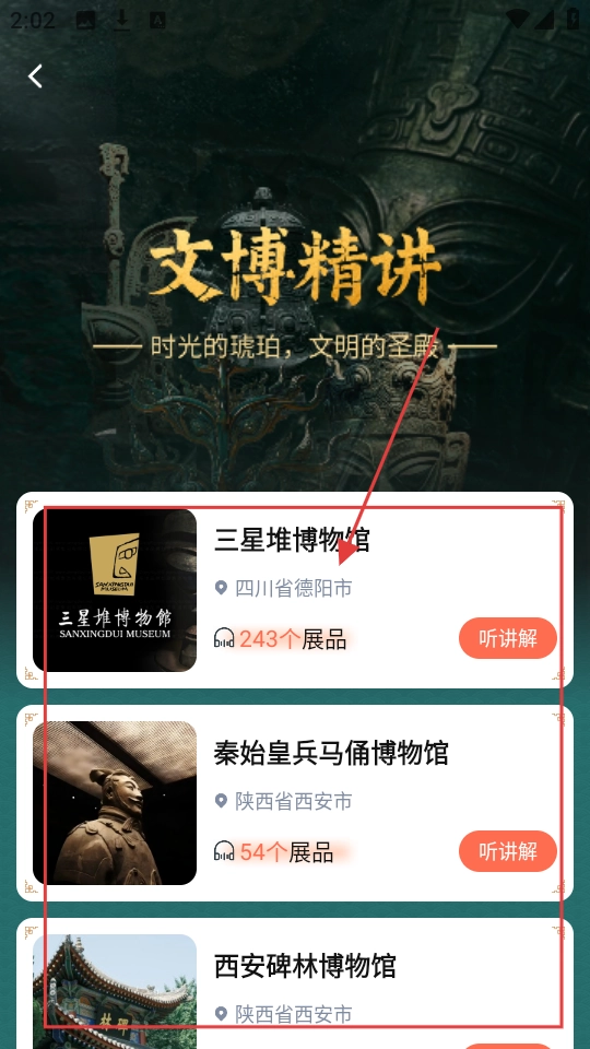 进入【文博精讲】页面后,你可以看到三星堆博物馆、秦始皇兵马俑博物馆等内容,点击【听讲解】就能了解相关信息。