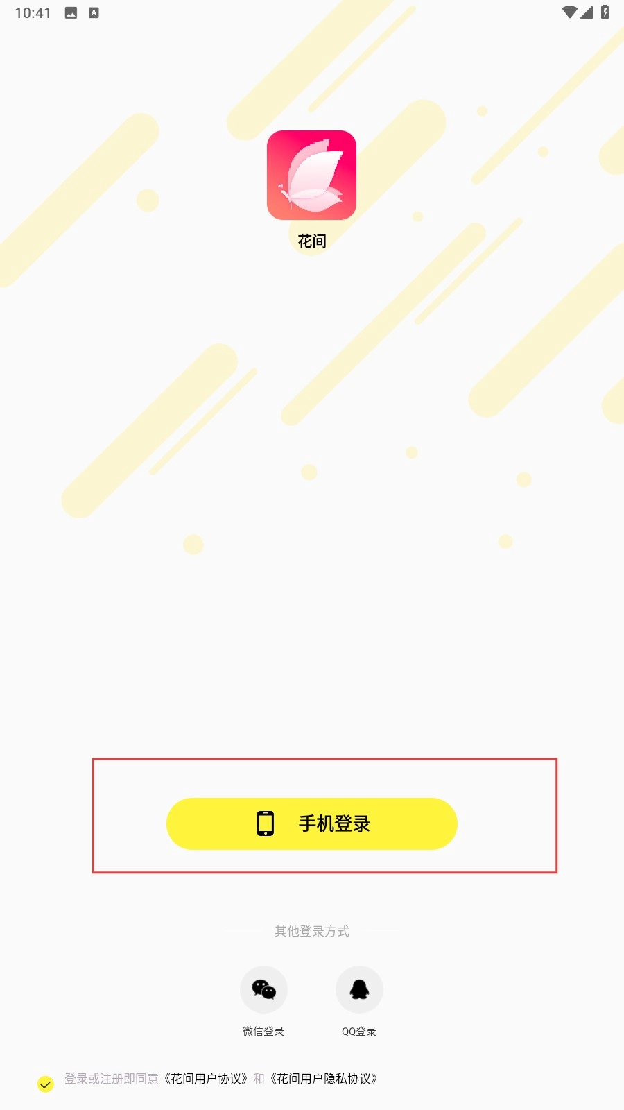 打开花间直播的引导页面,点击【立即体验】按钮,随后进入登录或注册的流程环节。