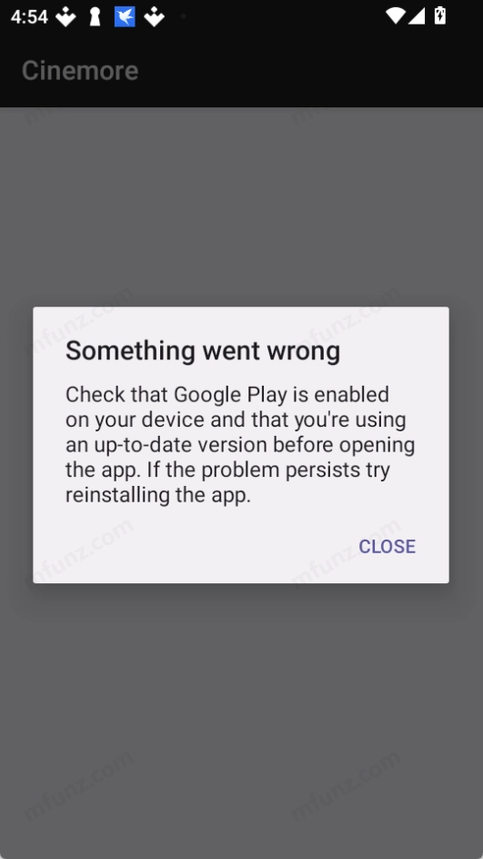在打开Cinemore之前,请确认是否已经安装并启用了Google Play。由于Cinemore依赖谷歌商店运行,若未启用谷歌商店,将会弹出如下对话框。
