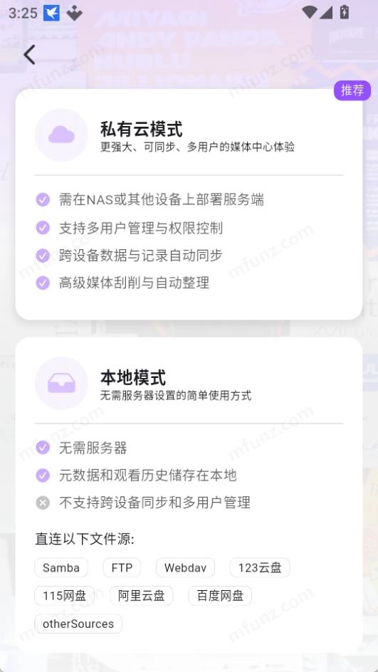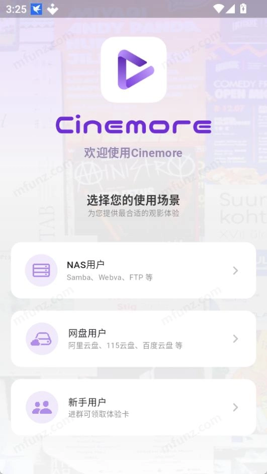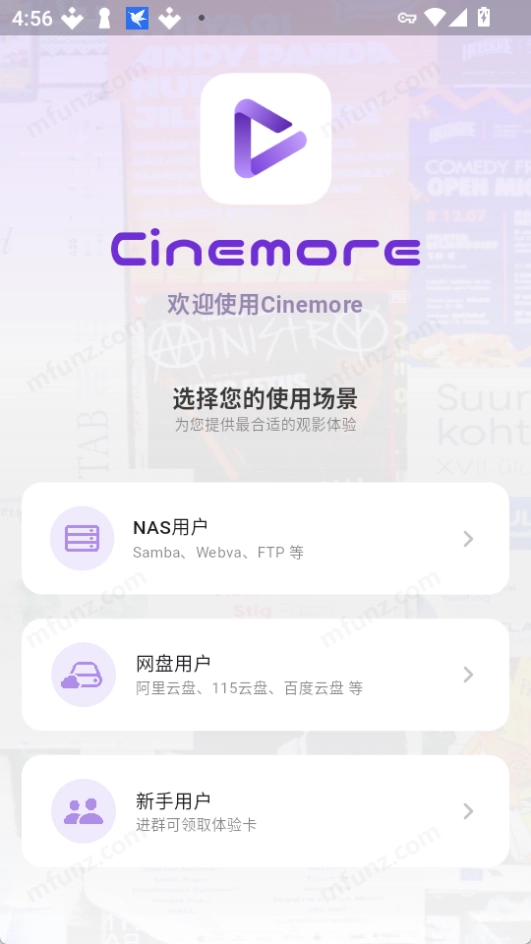 Cinemore nas用户支持samba、webva、ftp等功能,云盘方面兼容阿里云盘、115云盘、百度云盘等平台,用户可将这些云盘内的资源导入Cinemore进行播放。此外,新手用户还能领取体验卡福利。