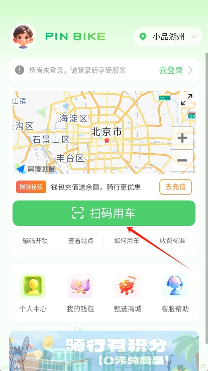 然后返回的首页点击“扫码用车”按钮。