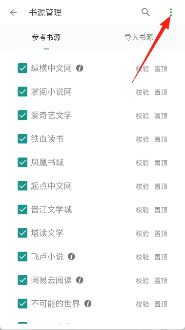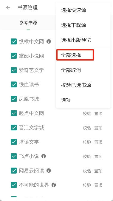 在弹出的列表里点击“全选”功能,就能把现有的书源都添加进去。