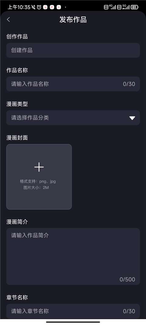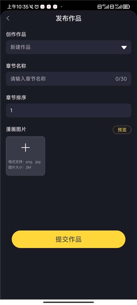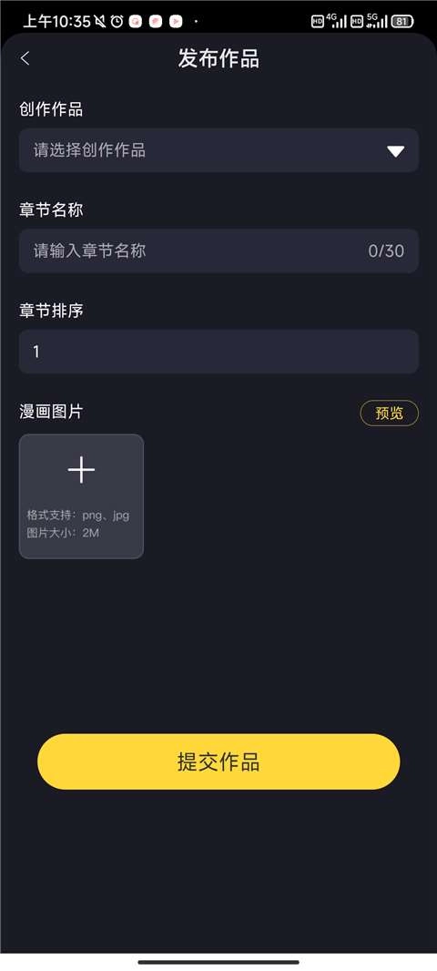 进入作品发布页面,选择创作作品选项,接着输入作品名称并完成章节排序设置。