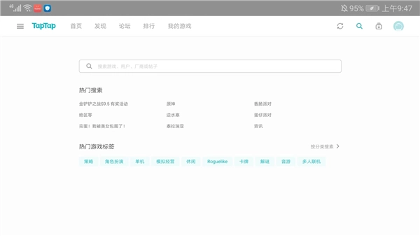 1、打开TapTap HD版,进入应用主界面后,能看到【首页】【发现】【论坛】【排行】和【我的游戏】这些频道,大家可以挑选一款自己感兴趣的游戏。