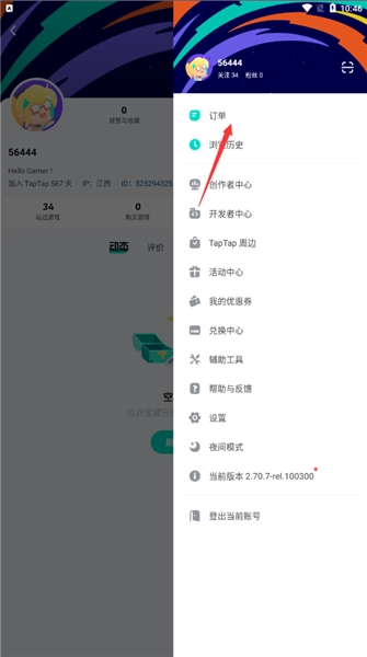 9、点击左上角的【三条杠】图标,即可打开菜单栏,其中包含关注、收藏、订单功能以及相关设置选项,以上便是TapTap HD版的使用方法。