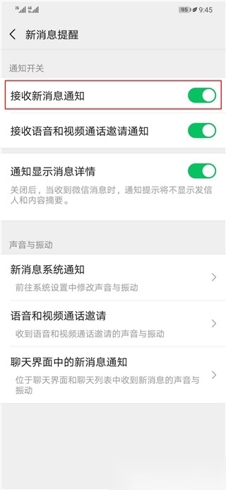 4. 根据个人需要选择提醒方式,例如在【聊天界面中的新消息通知】中开启【声音】或【振动】;
